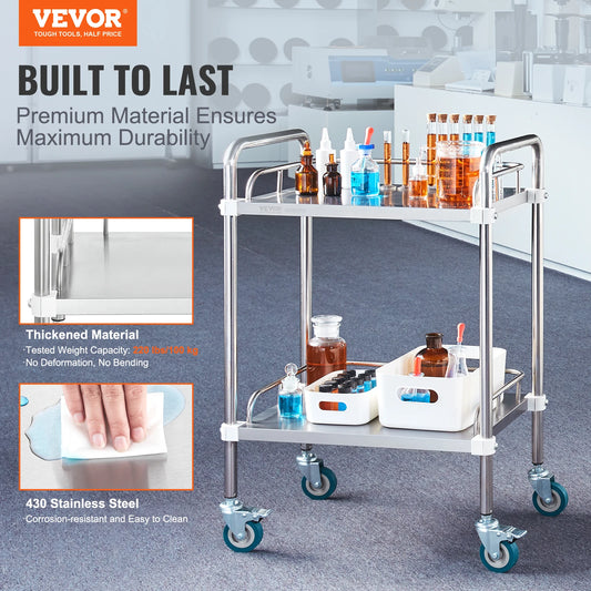 VEVOR Lab Rolling Cart 2-Shelf Stainless Steel Rolling Cart Lab Serving Cart Dental Utility Cart for Clinic Lab Hospital Salon