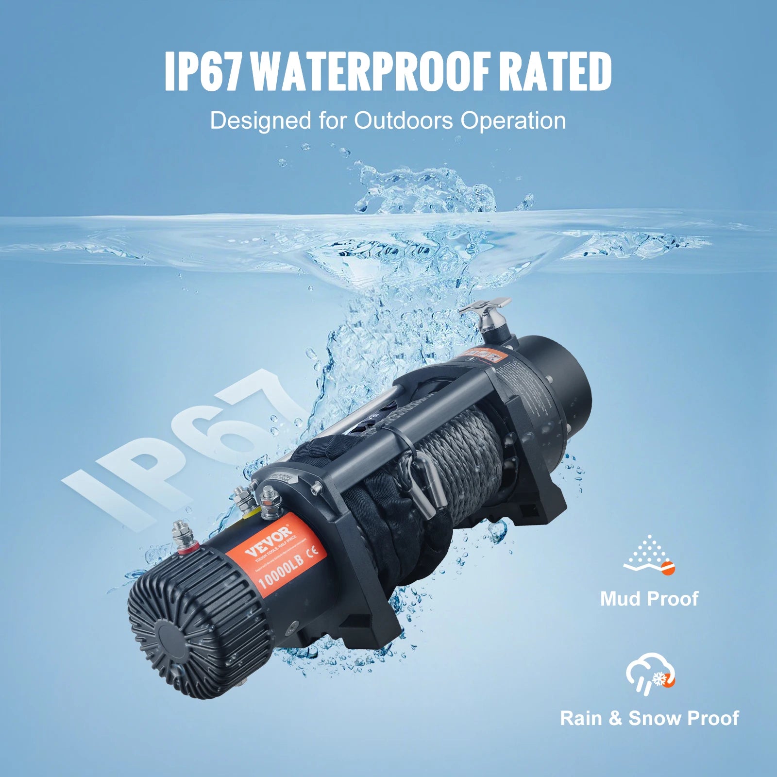 Built for Outdoors: VEVOR electric rope winch is featured with IP67 waterproof design. It’s built for handling harsh environment under complex conditions under mud, rainstorm, and snow weather.