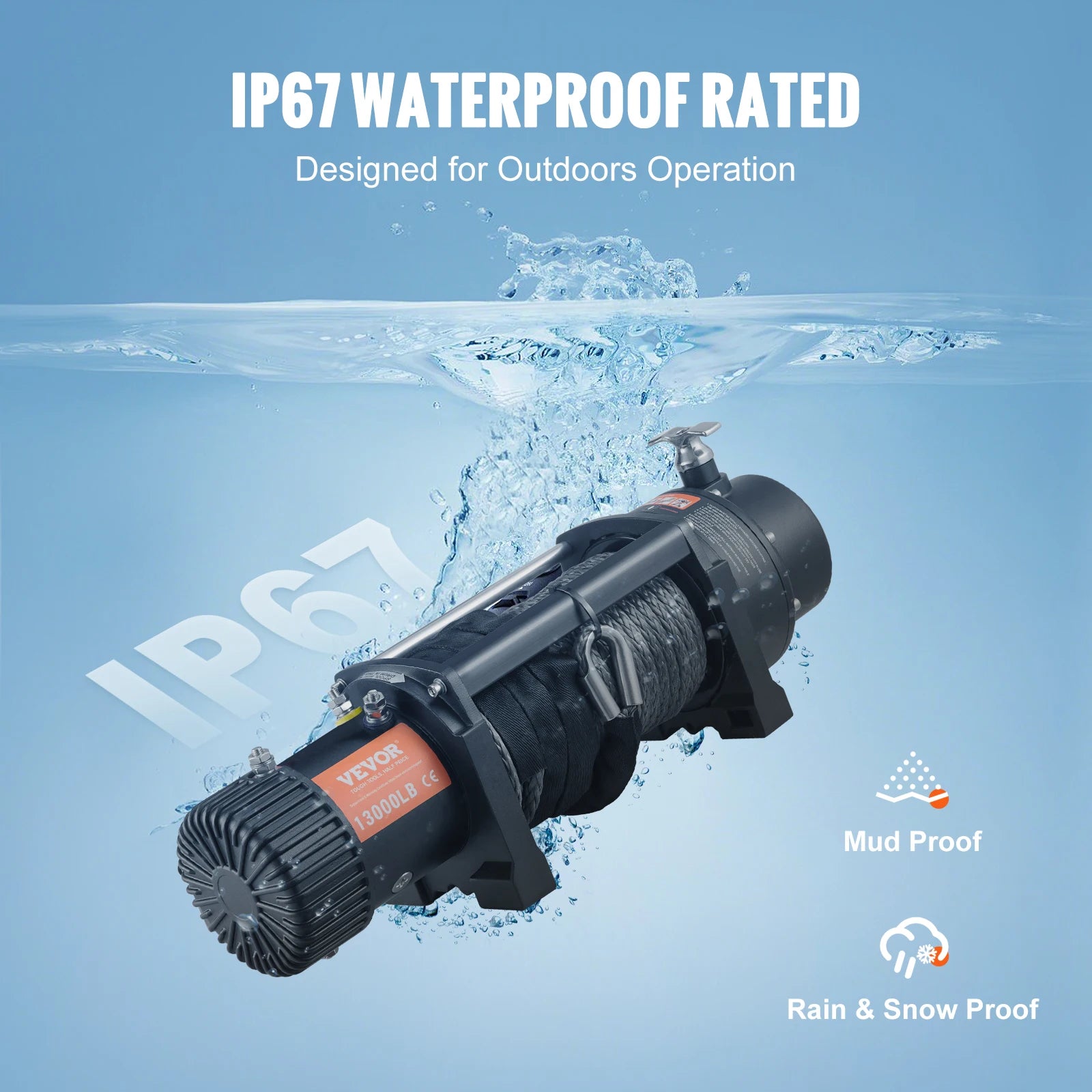 Built for Outdoors: VEVOR electric rope winch is featured with IP67 waterproof design. It’s built for handling harsh environment under complex conditions under mud, rainstorm, and snow weather.