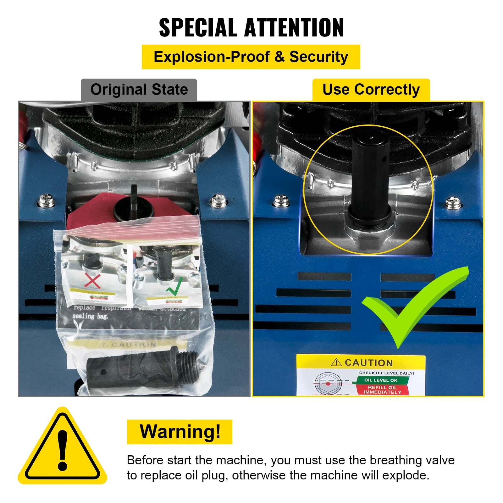 This scuba compressor is upgraded with durable metal fences in front and beside the machine body. The machine also is equipped with an explosion-proof design, which provides your security in various aspects. Warning: Please replace the oil plug to the breathing valve before starting the machine; otherwise, the device will explode.