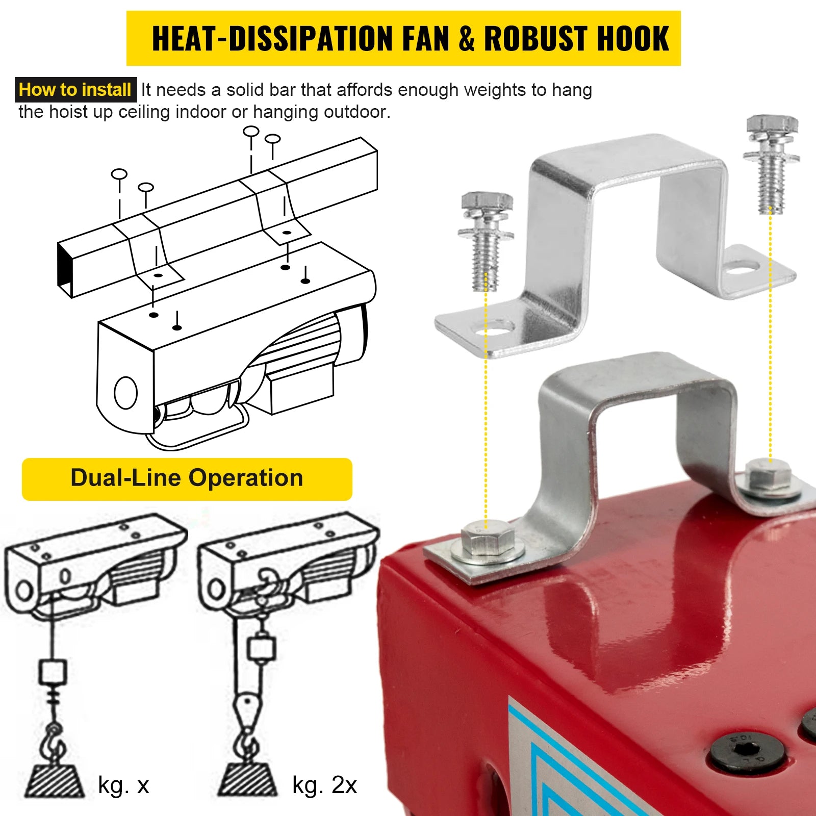 【Wide Application】: The power hoist is suitable for factories, warehouses, construction sites, carmakers, railway constructions, etc. It is an ideal tool for working in harsh indoor or outdoor environments. Please use it among the bar's width and height to compatible with the inner sizes of mounting brackets.