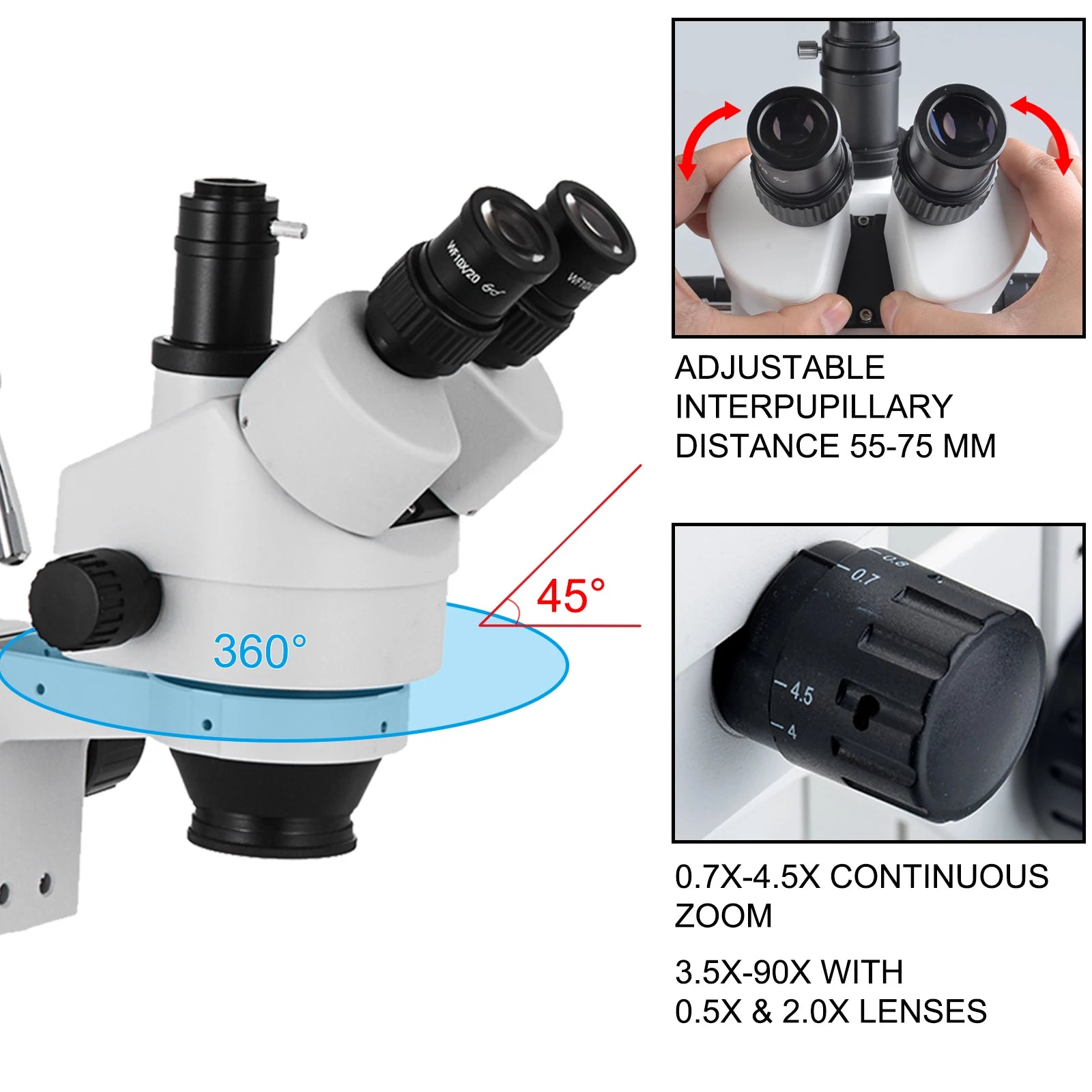 This product is a professional trinocular stereo microscope designed to meet the demand of microscopy needs. It has a 3.5X-90X zoom range when used with 0.5X and 2.0X lenses (included). The digital microscope is adjustable in working distance, interpupillary distance, and diopter. It is widely used for PCB soldering repair, insect observation, jewelry identification, etc.