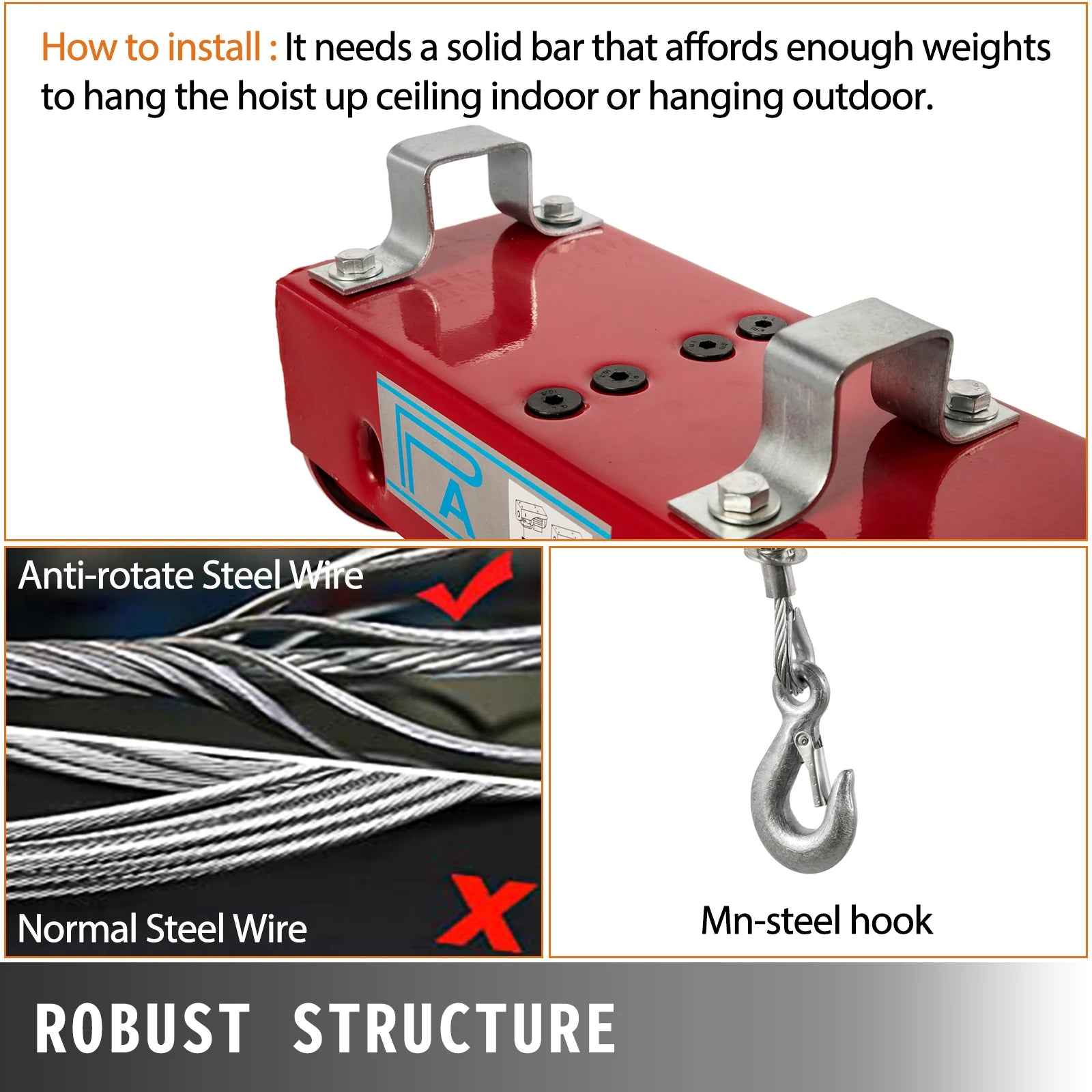 Premium Structure: This electric hoist winch is constructed by alloy shell and galvanized steel wire, keep out corrosion, rust, and rain. The steel line length: 39.4 ft/12 m; Diameter: 0.16 in/4 mm. Moreover, The metal fixing ring is adjustable along with your various needs and can be installed easily.