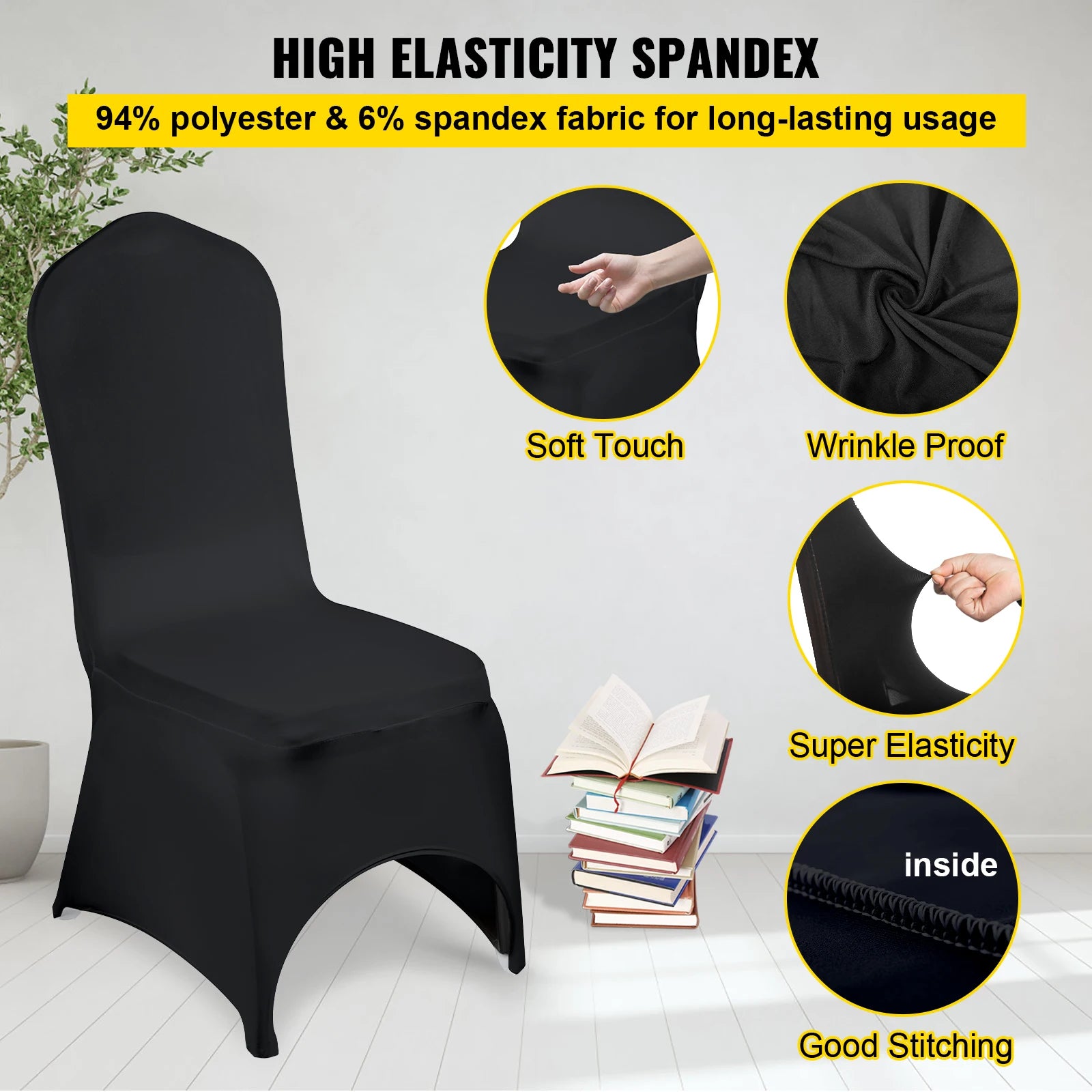 Protective & Elastic Material: Color: Black; Material: 94% polyester & 6% spandex. Strong material with good stitching provides you with extra comfort and elasticity. Universal chair covers are designed to keep your chair from accidental spills, pet scratches, daily stains, and tears. Besides, elegant black is a good option to look for an easy and simple way to turn your old chairs into gorgeous wedding reception chairs.