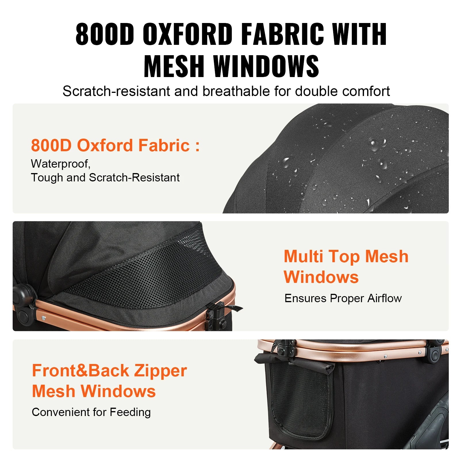 Multiple mesh windows of the dog stroller give your pet a wider field of vision and a closer connection to the outside world. The sturdy 800D Oxford fabric ensures the stroller can withstand the test of time, ensuring safety and comfort even when your pet gets playful.