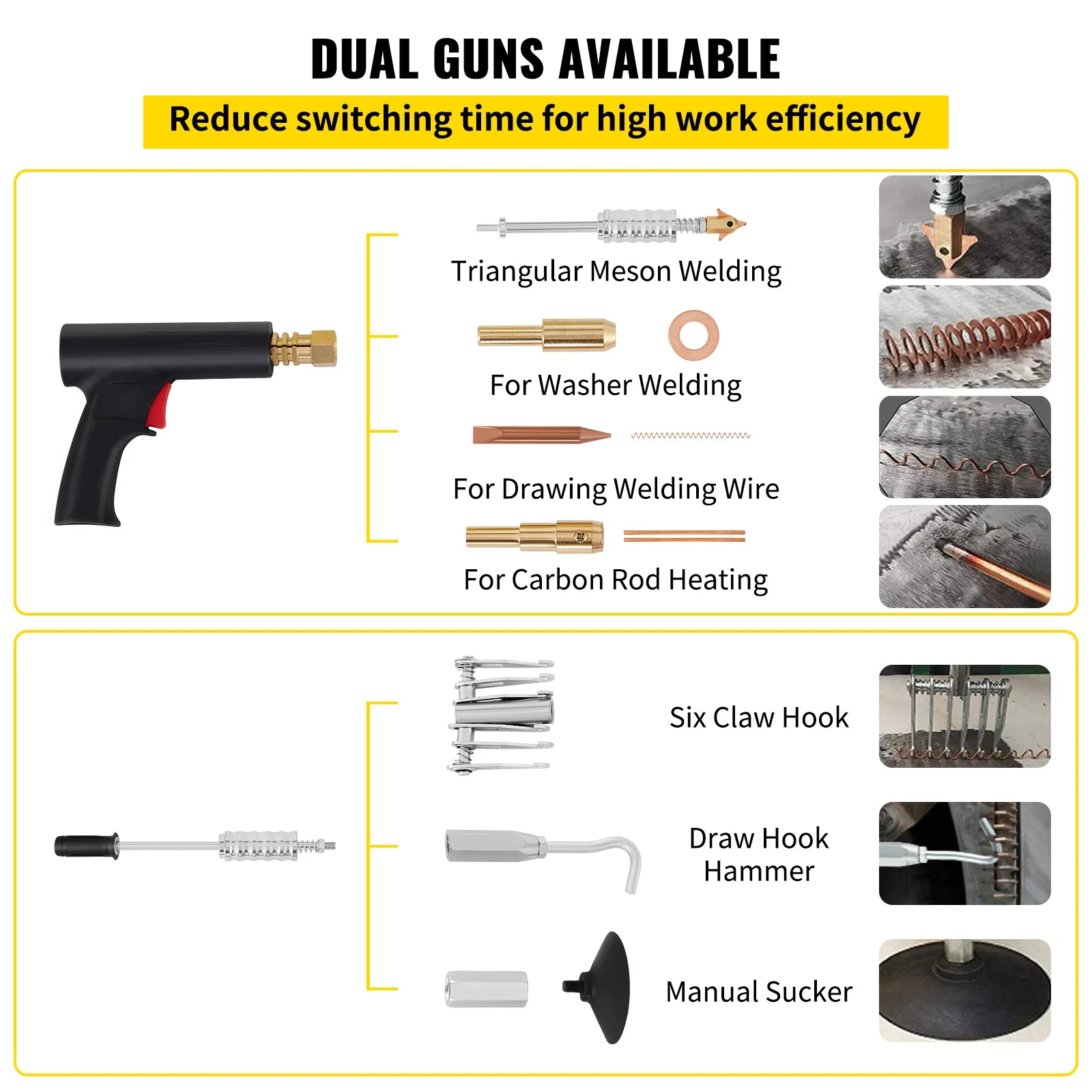 2 Powerful Welding Guns: The welding torch and dent puller have ultra-high hardness. Equipped with 2 welding guns, you can quickly switch between different functions, and different accessories can be replaced to repair different dents. Time and effort saver, what more could you ask for?