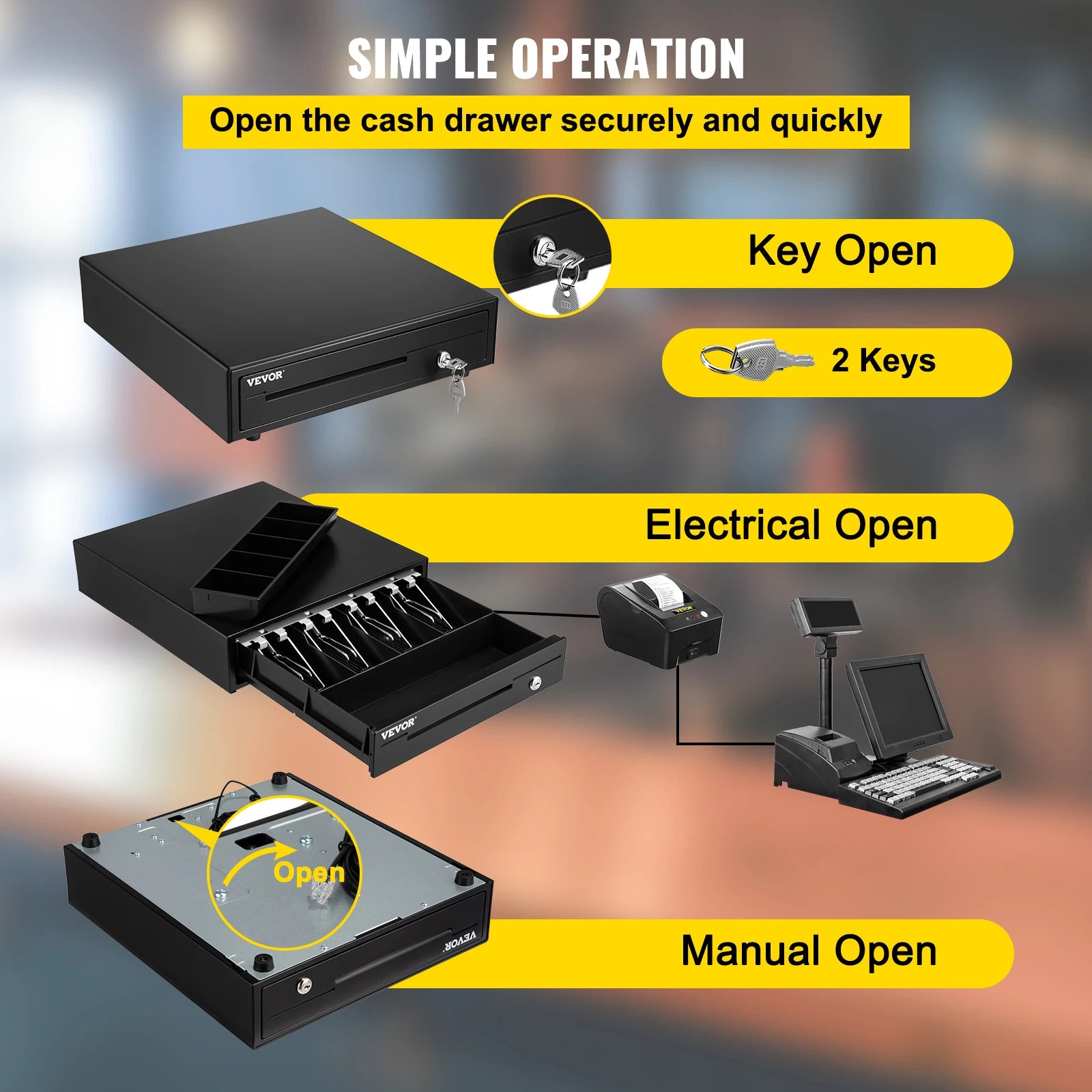 3 Ways to Open: The cash drawer under the counter will open by connecting with the receipt printer. Also, it can be opened with a key or emergency lever. You can open the drawer in seconds. With 3 secure ways to open this drawer, you will be prepared for any situation.