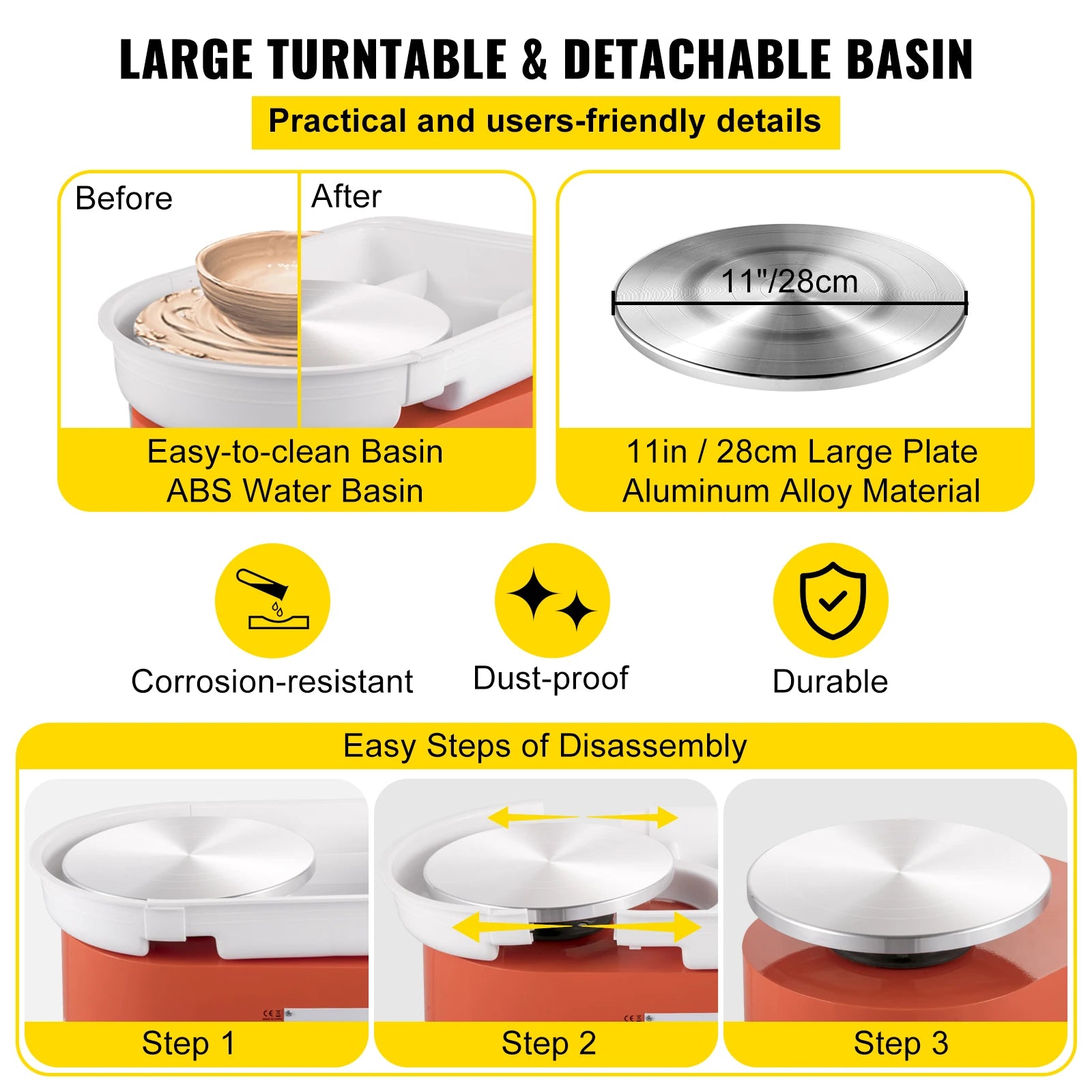 11" Aluminum Alloy Wheel: 11" / 28 cm large aluminum alloy turntable allows users to draw large pieces quickly. Besides, an enclosed water basin prevents mud from eroding and penetrating the fuselage. Moreover, it is detachable for easy cleaning.