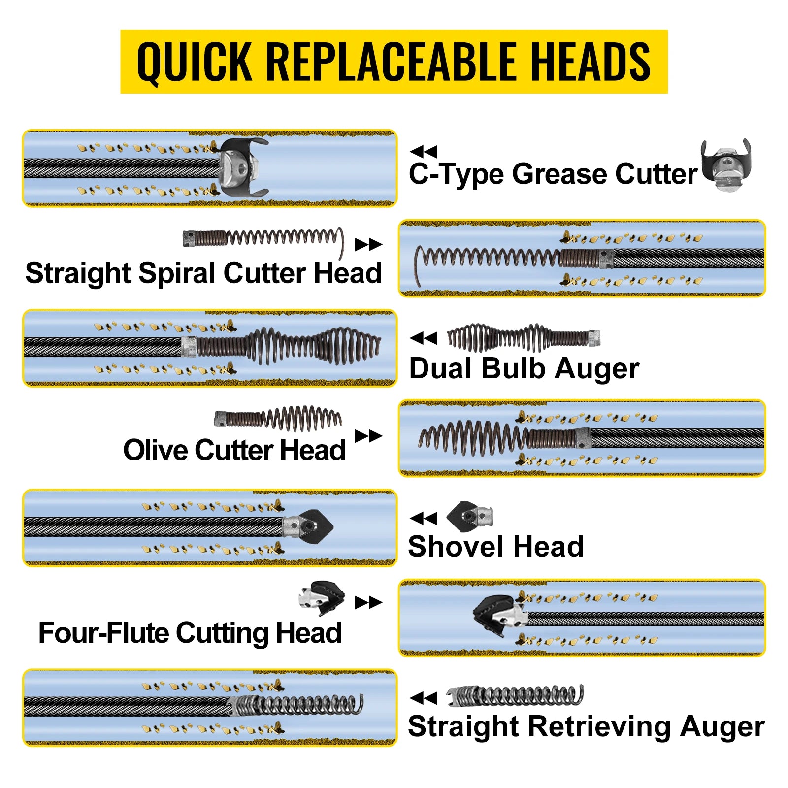 7 Replaceable of Cutters: Ideal for 0.8-3.9inch/20-100mm pipe. Prepare to be dazzled by 7 different shapes of cutters. The quick-change design makes the cutters easily connected or disconnected. Multiple attachments contribute a lot to clearing away various blockages.