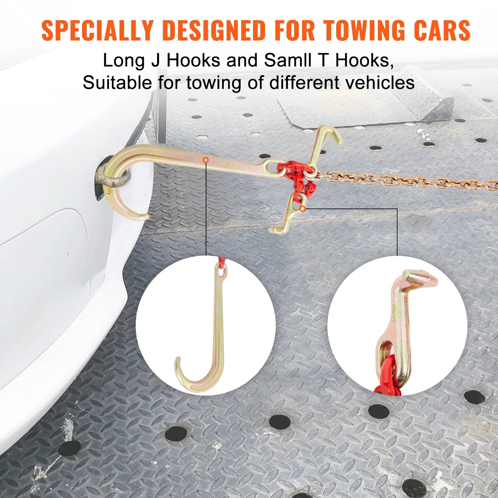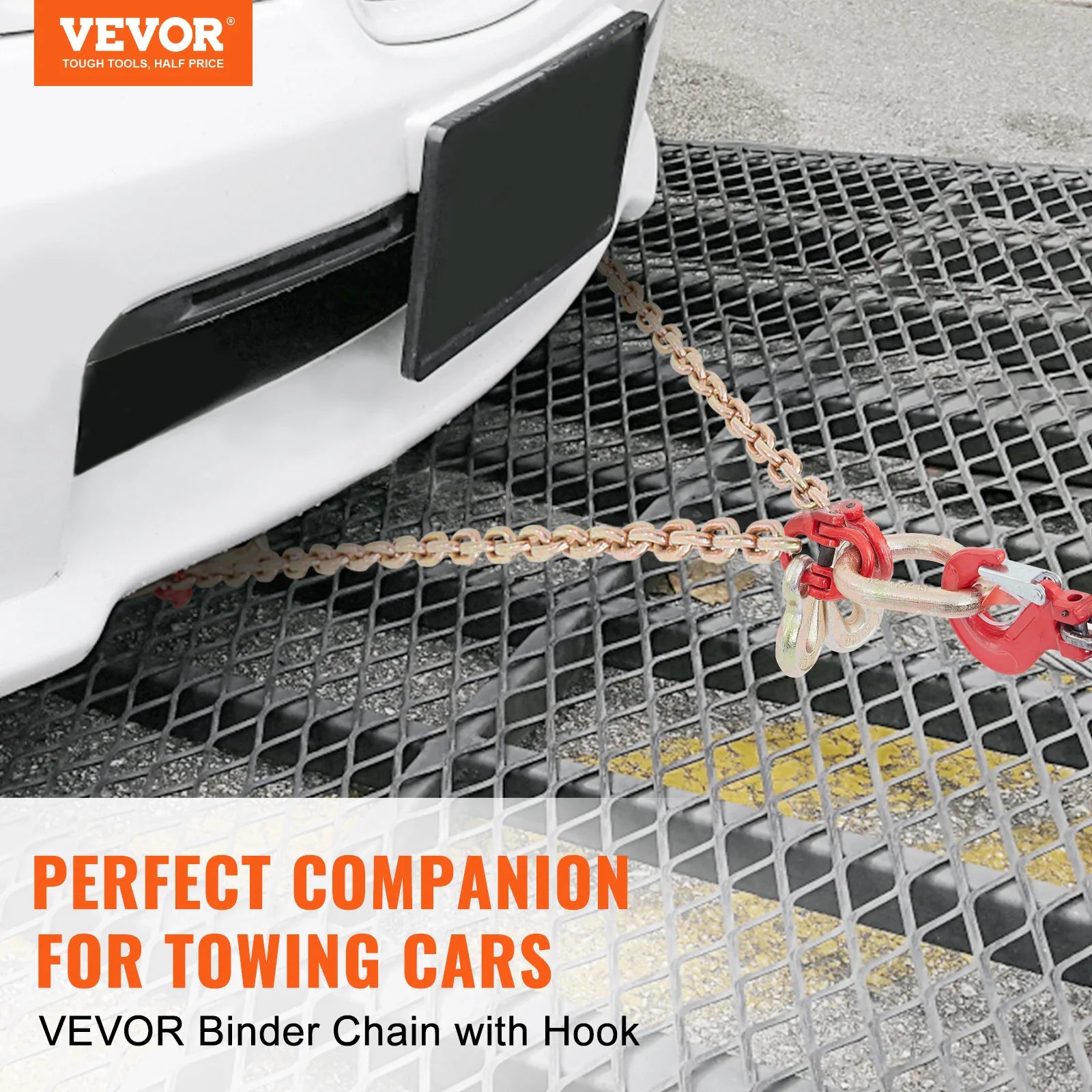 VEVOR, your exclusive tool expert. This binder chain is made of high-quality steel and has passed Grade 80 DOT certification. It is also equipped with adjustable hooks to fit various types of vehicles.