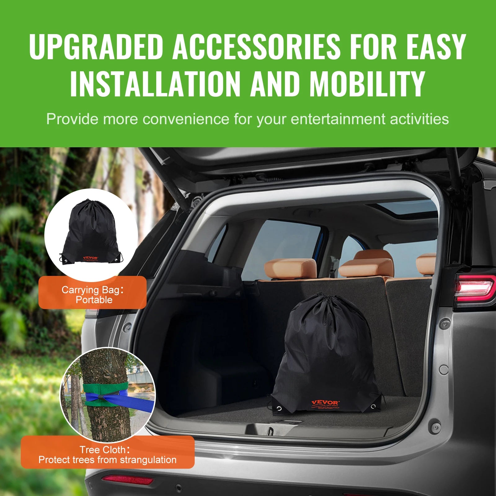 Upgraded Accessories: This zip lines for kids and adults includes everything you need. It adds a portable bag for easy storage and mobility. It comes with two tree protectors to prevent damage to trees, also serving as slack line protectors for increased durability. The tensioner effortlessly tightens and secures the straps with simple operation.